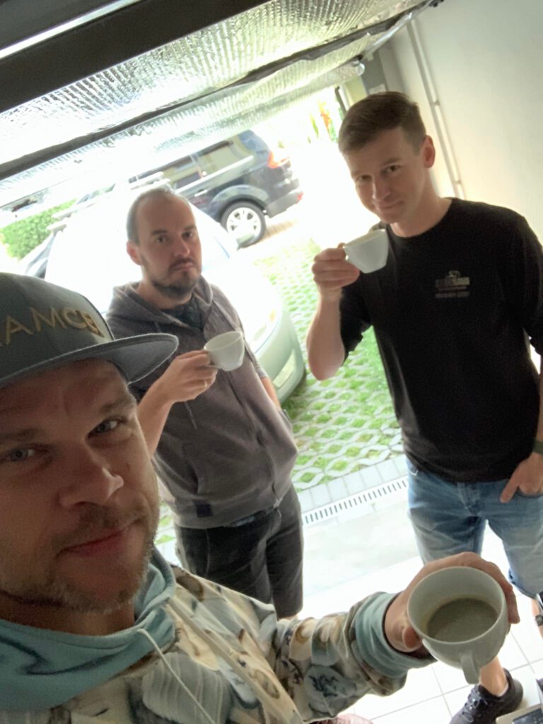 Chwilkę przed godziną „W” jesteśmy u Filipa trzeci do tańca&różańca. A tam pewex. Kawka panowie? Pada retoryczne pytanie. Mówię spoko zatrzymamy się na stacji. Filip pokazuje, że ekspres czeka na mielenie. No nic czikita na mordzie więc przycisk ON i lecimy z tematem i bajerą. Czaicie przed 5 rano a gość targał z domu do garażu maszynę do robienia kofeiny – sztos o tym będą pisać w legendach.