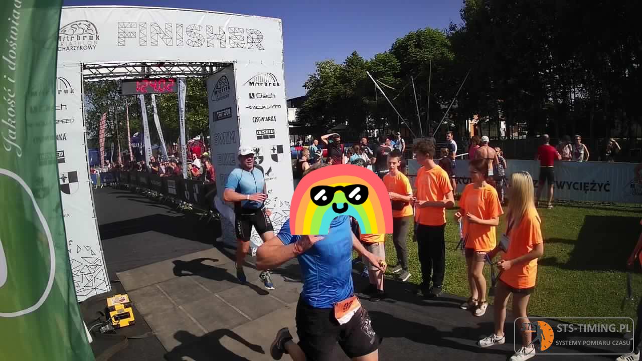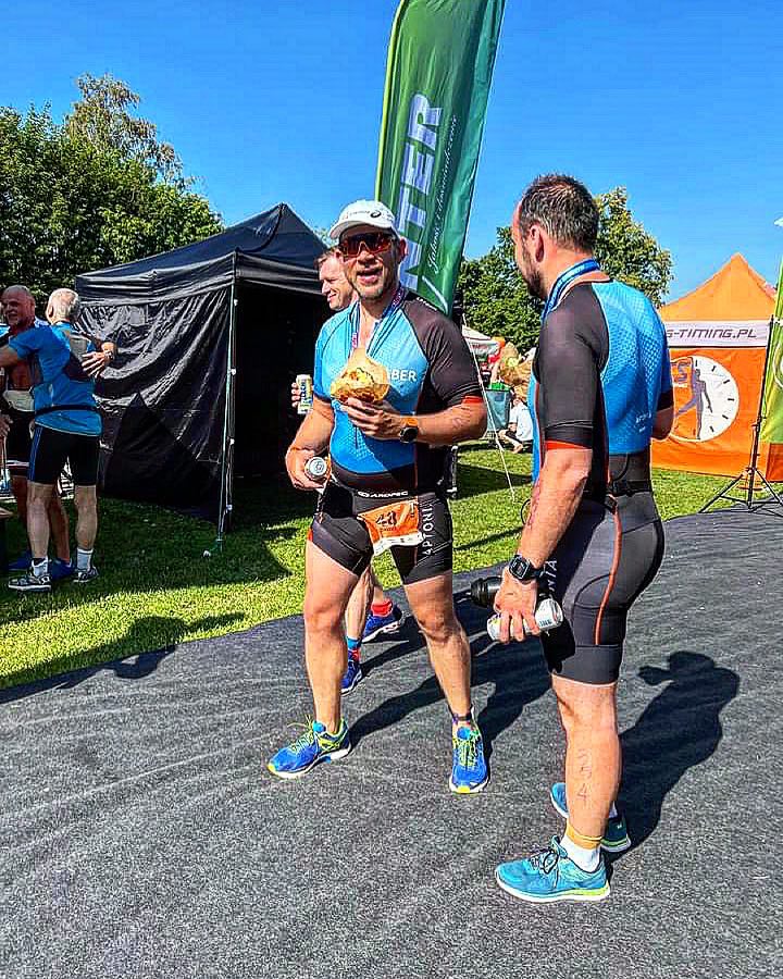 W drodze na T1 wybiegam rozbierając się z szybkością inflacji. Sam byłem zdziwiony, że oddech spokojny i nie rozglądam się za szerpami z tlenem w obozie pierwszym. Wszystko idzie tak jak się nie spodziewałem czyli epicko. Rower jak to rower. Nigdy nie byłem cudownym dzieckiem dwóch pedałów. Zima nie była przepracowana na trenażerze. Wiem. No ale nic jak na moje warunki średnia prawie 33 km/h to całkiem spoko wynik. Dla mnie nawet bardzo. Wracając do tytułu tej rozprawki parówki. Parówkowozy sypały się paczkami ściśnięte jak berlinki w folii. Sędziów widziałem 2x może dlatego, że waha droga? Zapamiętałem gościa z nr 75 trzymał się kolegi przez 20km jak jaszczomb podwyżki stóp %. Pozdrawiam z tego miejsca. Zapytam przekornie do toitoia też wchodzicie razem?