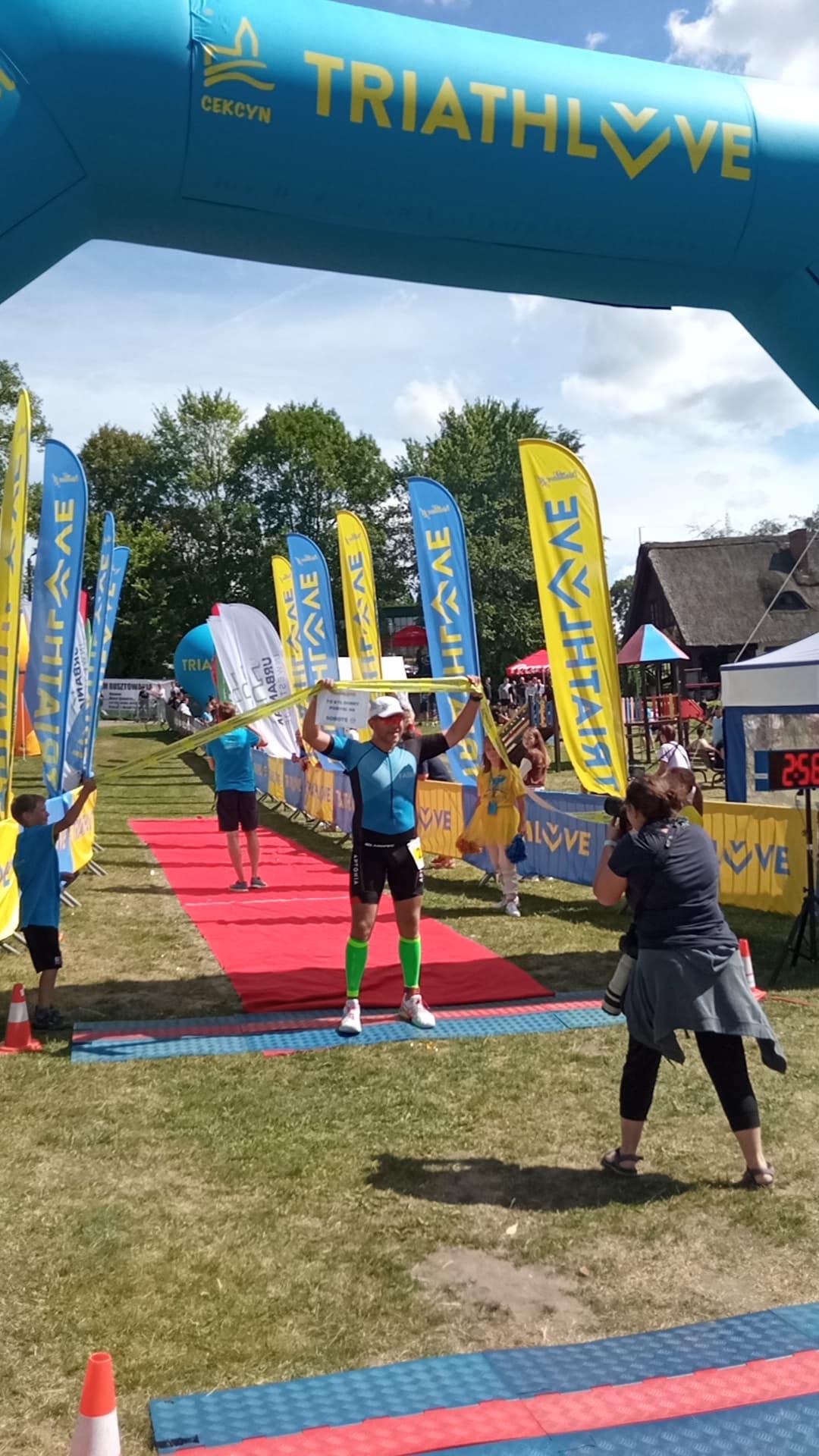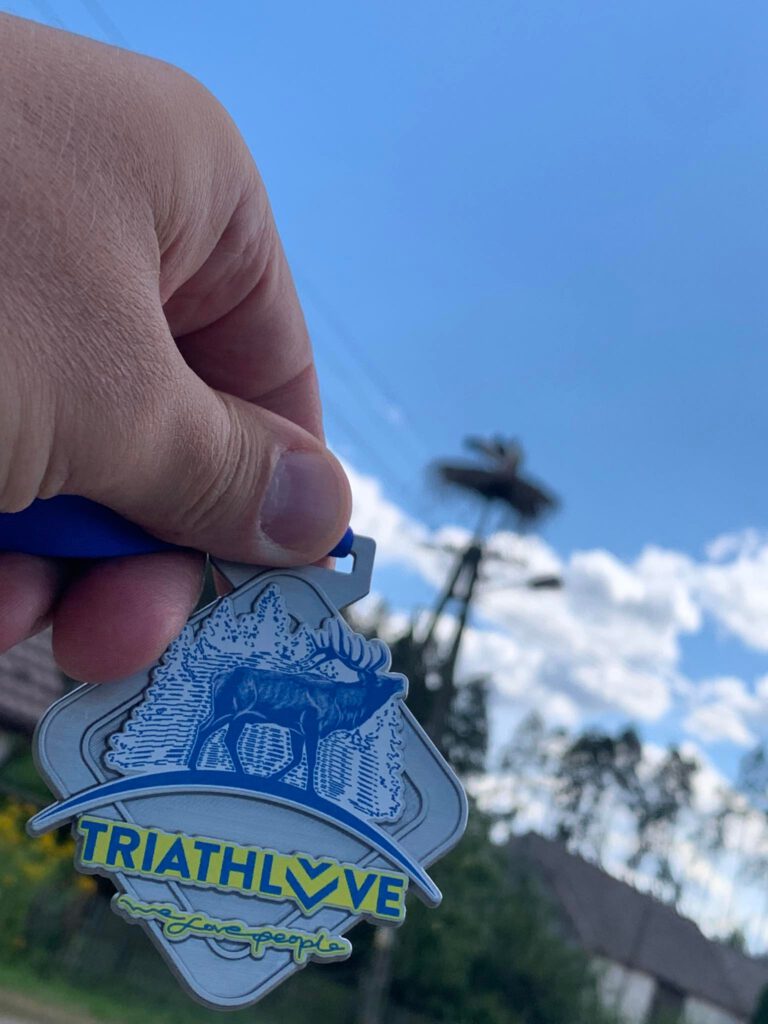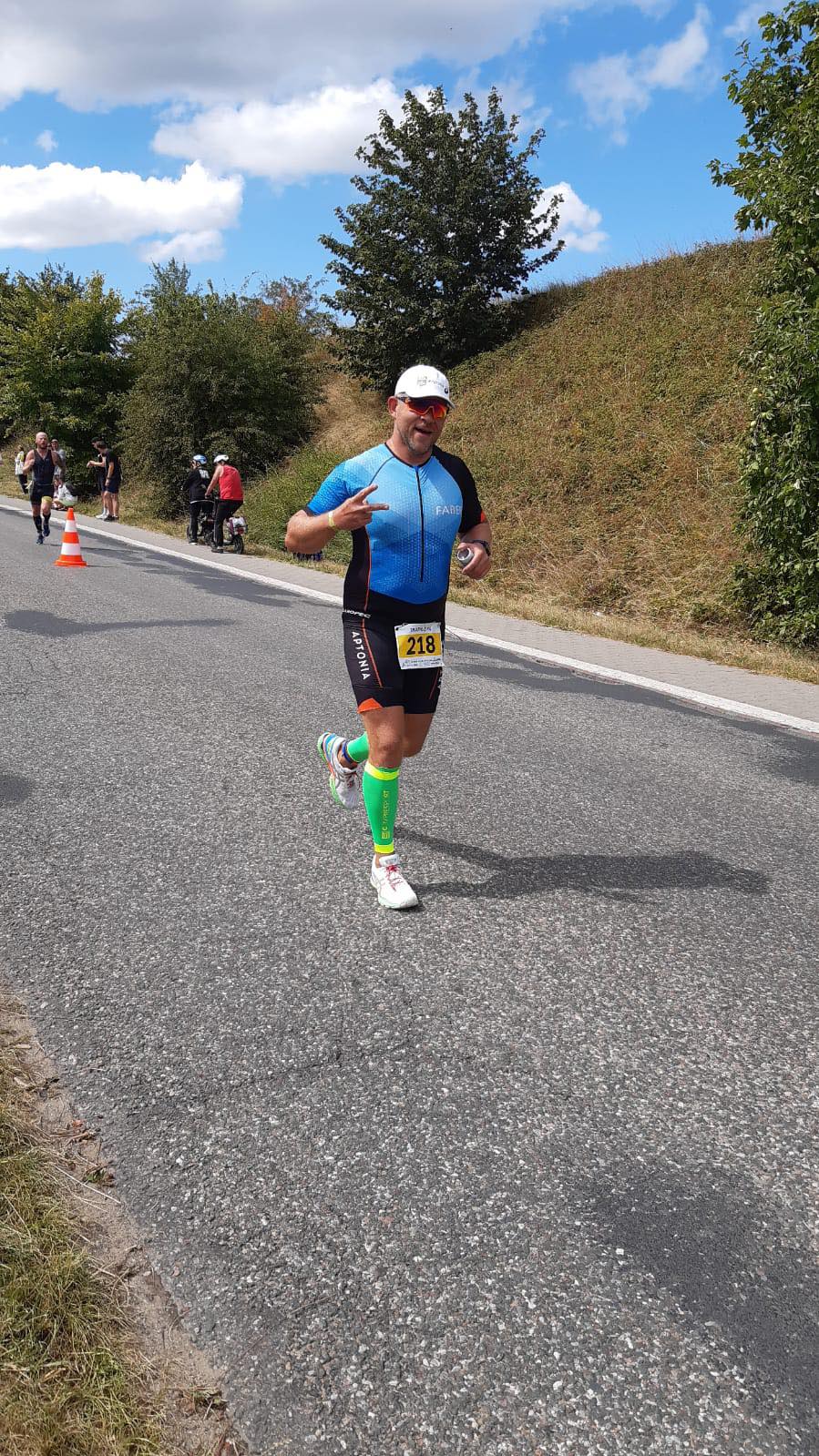 Wbiegam na T1 a tam rysiek leży na glebie. Mówię sobie spoko to dekatlon ale do k nędzy jaka trzeba być łajzą żeby nie szanować sprzętu kogoś z belki? A niech Ciebie inflacja pochłonie. Wyjeżdżając ze strefy wspomniałem legendy o tym asfalcie co tam bytuje i nie kłamali nic…dramat to mało. Po obu stronach dolewki, geometrycznie pędzony garbem w przekroju poprzecznym plus dodatkowo znaczone co większe dziury – wszędzie kolorem yellow. Jazda po tym czymś to ekwilibrystyka level f bicz. Ja mam szosę i jakoś przeżyłem ale takich czasówek to było mi po prostu żal.pl. Trasa dość szybka na pętli 2×7,5 km. Więc kończyłem z uśmiechem i po T2 słońce uśmiechem zaczęło przypalać nasze truchła. Pierwsza piątka na dużym luzie ale 2ga to już spadek jak apator do pierwszej ligi z ekstraklasy. Wolontariusze nie mieli litości. Lejemy? Chce Pan na twarz? Mówię gram w pornolu czy jak? Ale jak dostałem to zrozumiałem, że właśnie tego potrzebowałem :D.