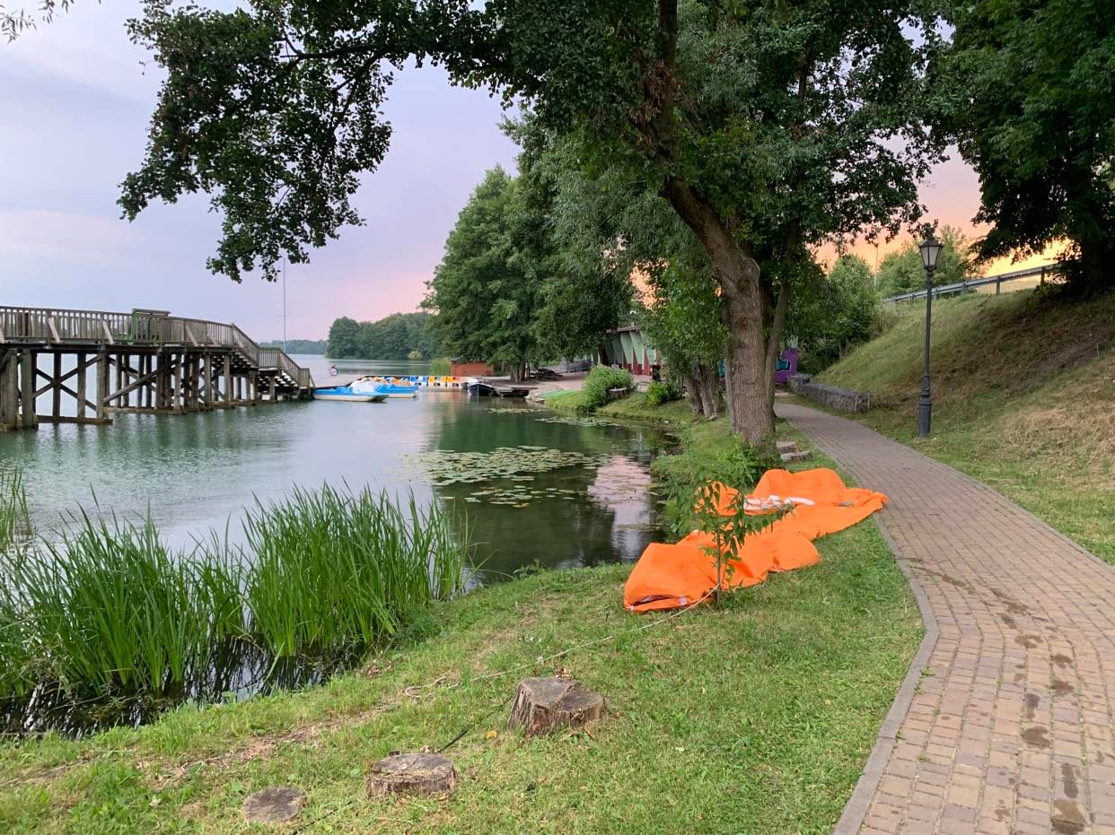 Cyk pyk i stoi. Ale już na biegu na pełnej k lecę w stronę startu bo rozjarany konferansjer na majku oznajmia, że za 4 min start, a ja jeszcze stanik instaluję i proszę jakiegoś ratownika żeby mnie zapiał od tyłu. No nic w drodze na koniec kolejki wskakuję z pomostu do wody żeby się ułożyć i słyszę START i poszli jak dziki w żołędzie…dobiegam na koniec kulejki i to był dobry nomen omen. Finalnie wyszło całkiem spoko ale to później. Woda jak woda mokra i przyjemna. Lubię tam mijać ludzi. 950m poszło dość szybko jak cena Pb95. Na brzegu wolontariusze krzyczeli jak poparzeni UWAGA na wyjście UWAGA na wyjście…no skarpa z trawą dosyć pionowa więc rzeczywiście niektórzy zapoznawali się z czarnoziemem.